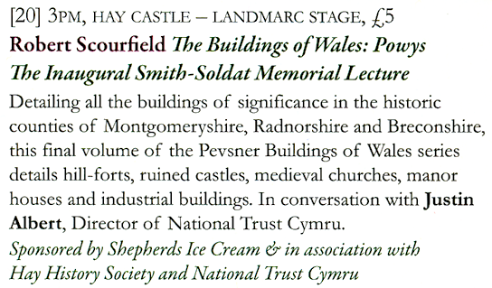 Last Sunday afternoon, we drove the short journey to the book town of Hay-on-Wye, where we had an appointment with the author Robert Scourfield. He was launching his new book, a revised version of the Powys volume in the Buildings of Wales series.